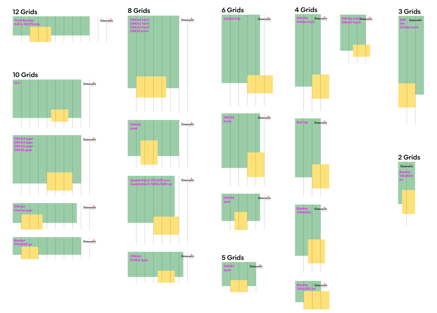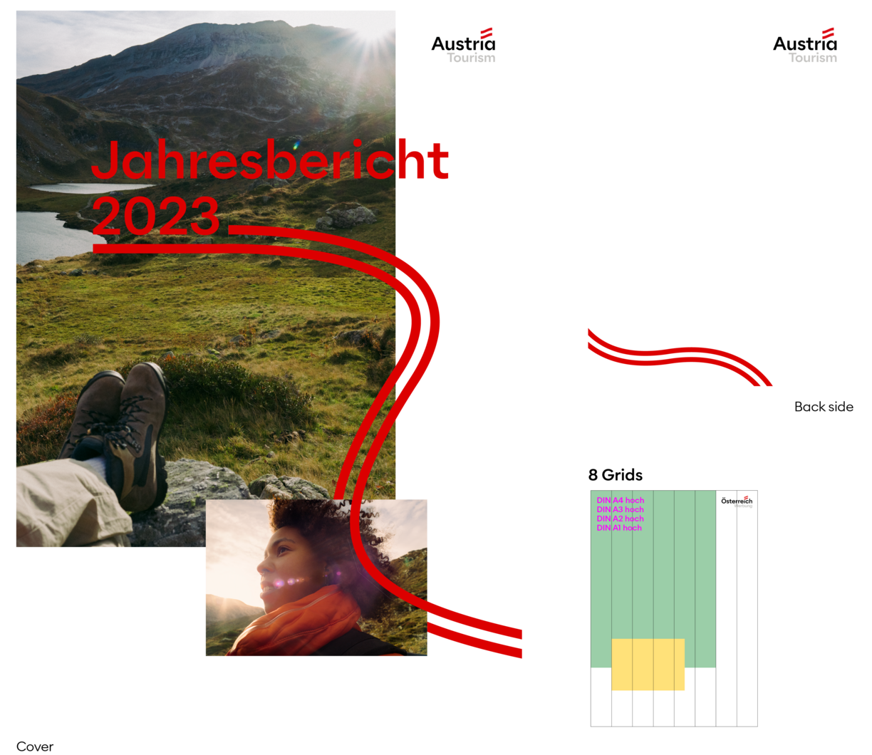 Most master templates consist of 4 versions that provide an overview of the various options. However, the arrangement can and should vary. Different arrangements convey a desired liveliness and lightness that support our “Lebensgefühl“ brand essence. The vibe can be just as lively.